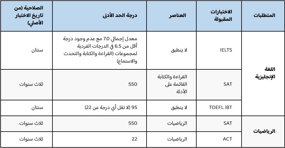 - الرياضيات: SAT/ACT أو ما يعادلها.