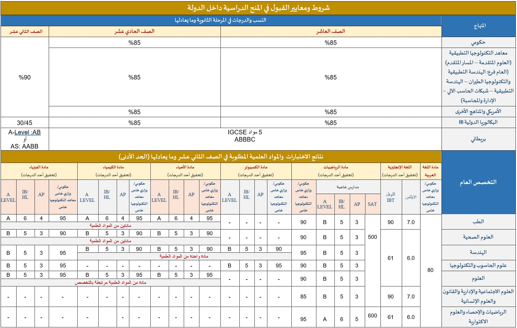 - أن يكون حاصلاً على نسبة مئوية، لا تقلّ عن (90%) في شهادة الصف الثاني عشر أو ما يعادلها، علمًا بأن هذه النسبة قابلة للتغيير من سنة إلى أخرى.